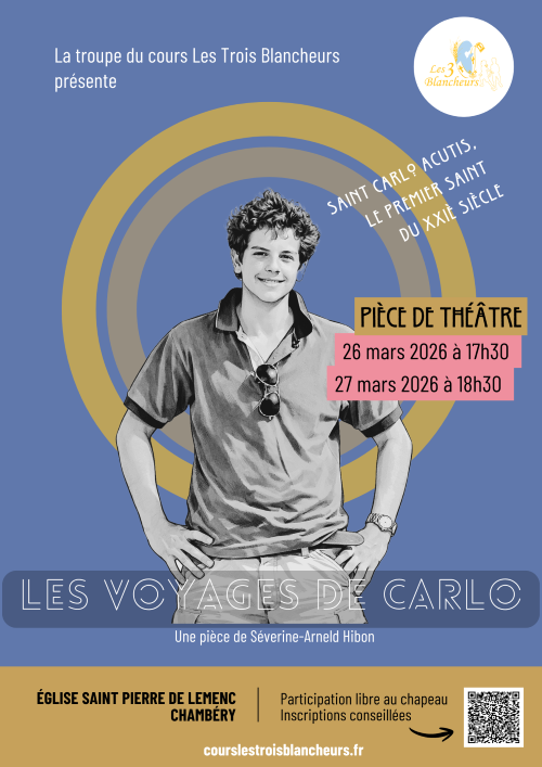 Réservation conseillée sur : https://www.helloasso.com/associations/association-les-trois-blancheurs/evenements/piece-de-theatre-les-voyages-de-carlo-acutis