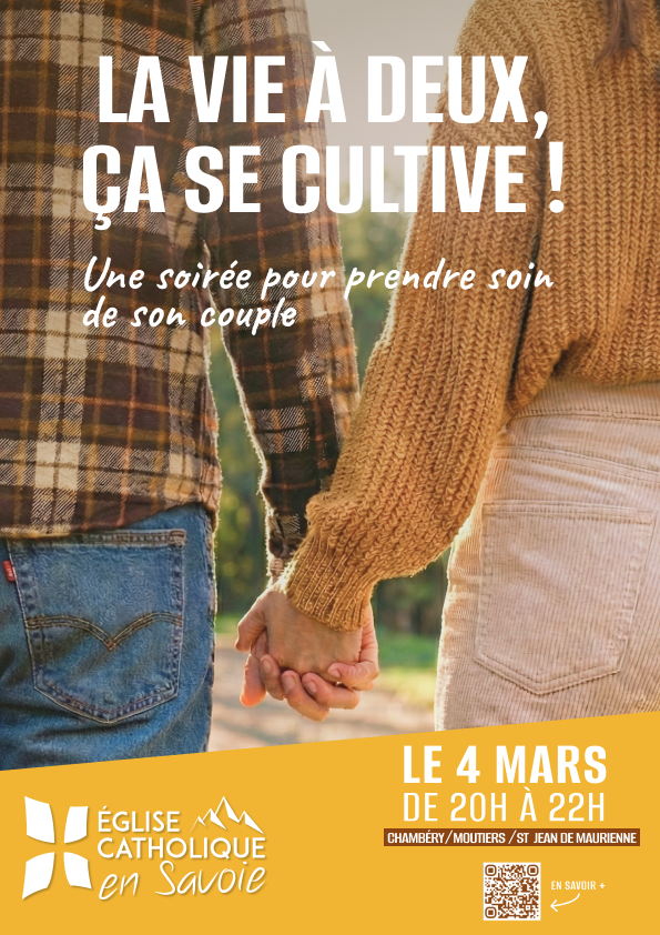 Le mercredi 4 mars, de 20h à 22h, en simultané sur les 3 diocèses (MD chambéry, maison paroissiale Moutiers, lieu à définir à St Jean de Maurienne). Soirée pour TOUS les couples !
